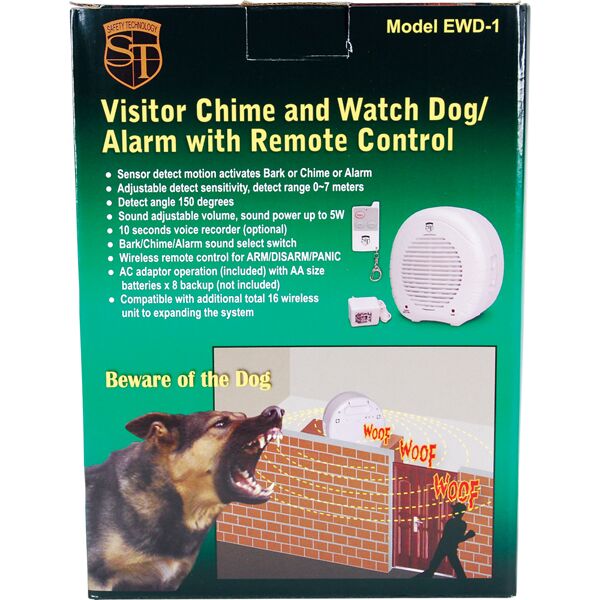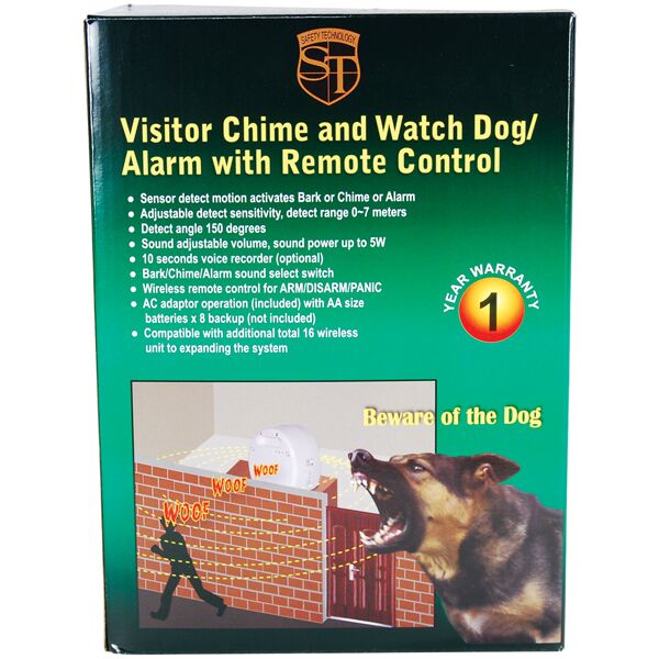 This multifunctional BARKING DOG ALARM system uses an electronic radar-wave sense control. This technology allows it to “see” through wood, cement, brick, glass, etc. When an intruder enters the 1000 triangle of protection, it automatically begins barking like an angry dog. From outside, it sounds like you have a very unfriendly dog inside. It also can announce visitors with a chime or alarm. The radar sensitivity is adjustable from 10-20 feet. Volume is also adjustable. Stands 9 inches tall. Powered by AC power supply. Also takes 8 AA back-up batteries (not included) in case of power loss. Unit needs to face in the direction you want to detect motion. Detection is limited from the sides and rear. The included remote control lets you Arm and Disarm the system, as well as set off a Panic alarm. You can also connect additional sensors (HA-MOTION, HA-MOTION-OD or HA-SENSOR). Can add up to 16 additional sensors to monitor larger areas.